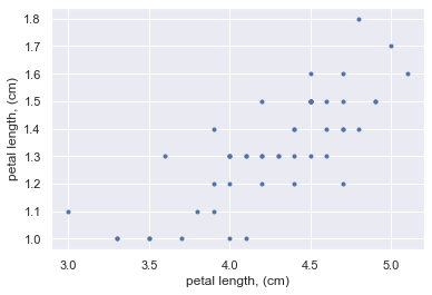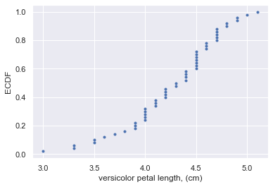 The subset of the data set containing the Iris versicolor petal lengths in units of centimeters (cm) is stored in the NumPy array versicolor_petal_length.