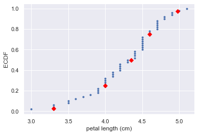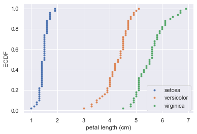 We will now use ecdf() function to compute the ECDF for the petal lengths of Anderson’s Iris versicolor flowers. We will then plot the ECDF.