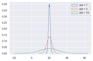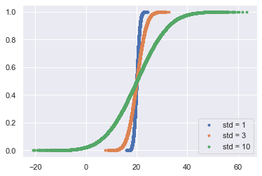 _ = plt.legend(('std = 1', 'std = 3', 'std = 10'), loc='lower right')