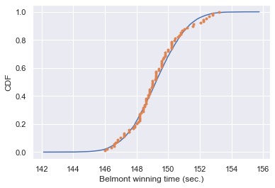 Since 1926, the Belmont Stakes is a \(1.5\) mile-long race of 3-year old thoroughbred horses. Secretariat ran the fastest Belmont Stakes in history in \(1973\). While that was the fastest year, 1970 was the slowest because of unusually wet and sloppy conditions. With these two outliers removed from the data set, we will compute the mean and standard deviation of the Belmont winners’ times. We will sample out of a Normal distribution with this mean and standard deviation using the np.random.normal() function and plot a CDF. Overlay the ECDF from the winning Belmont times {% fn 2 %}.
