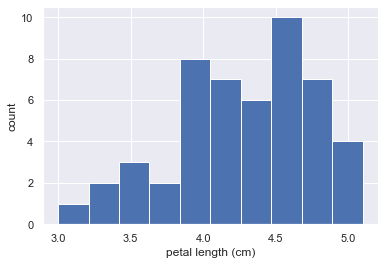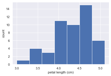 We will plot a histogram of the petal lengths of his 50 samples of Iris versicolor using matplotlib/seaborn’s default settings.
