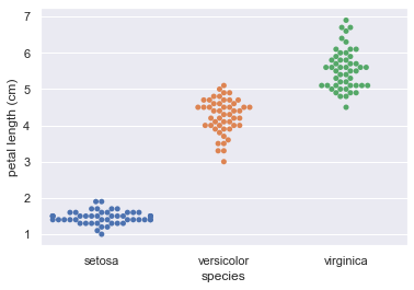 We will make a bee swarm plot of the iris petal lengths. The x-axis will contain each of the three species, and the y-axis the petal lengths.