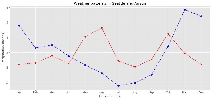 ax[0].plot(seattle_weather['MONTH'], seattle_weather['MLY-PRCP-75PCTL'], color = 'b', linestyle = '--')