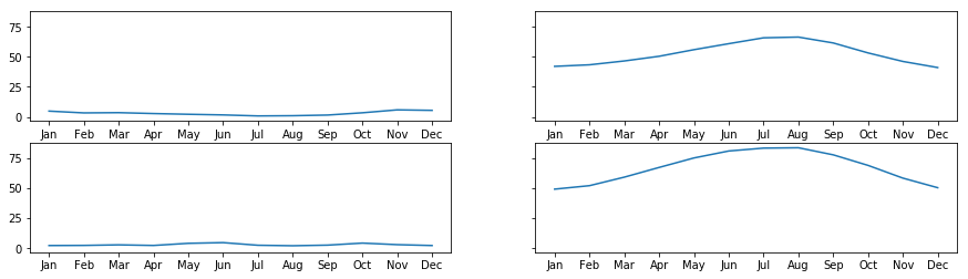 fig,ax=plt.subplots(2,2, sharey=True, figsize=(15,4))