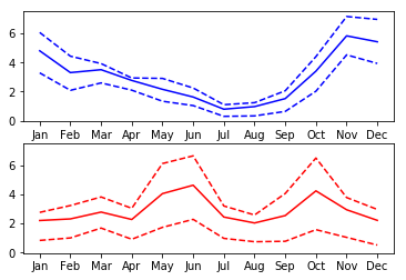 ax[0].plot(seattle_weather['MONTH'], seattle_weather['MLY-PRCP-25PCTL'], color = 'b', linestyle = '--')