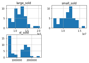 avocados_2016[["small_sold", "large_sold", "xl_sold"]].hist()