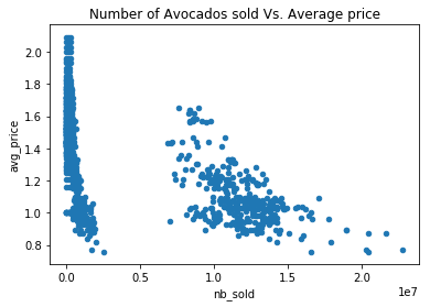 avocados.plot(kind='scatter', x='nb_sold', y='avg_price', title='Number of Avocados sold Vs. Average price')