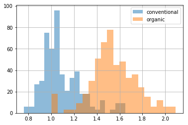 plt.legend(['conventional', 'organic'])